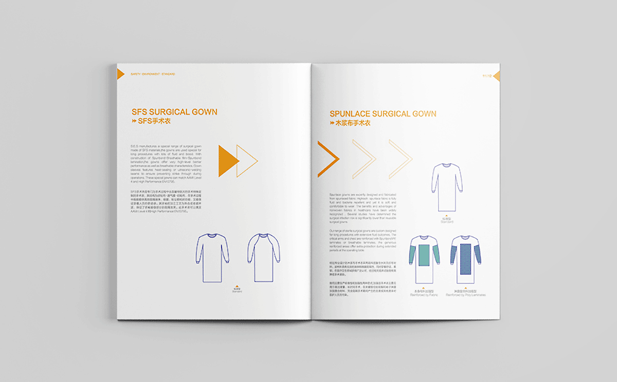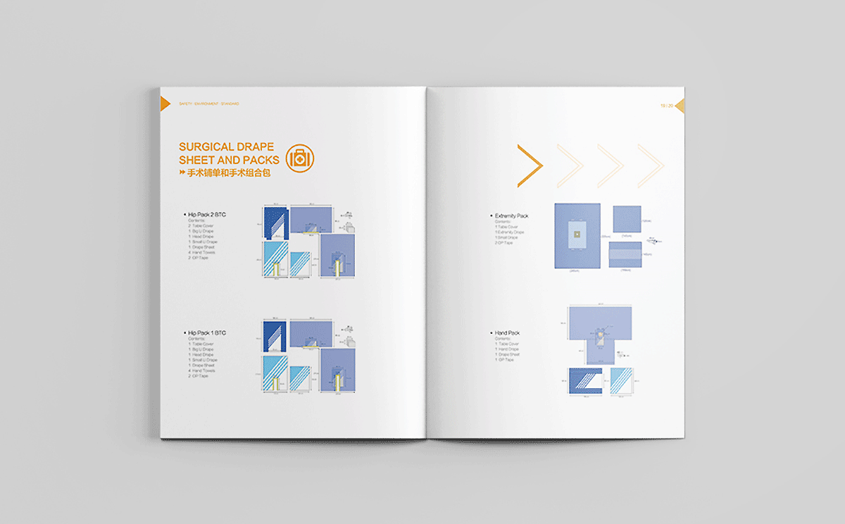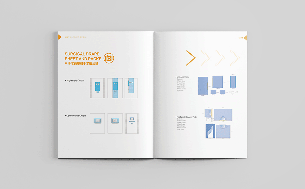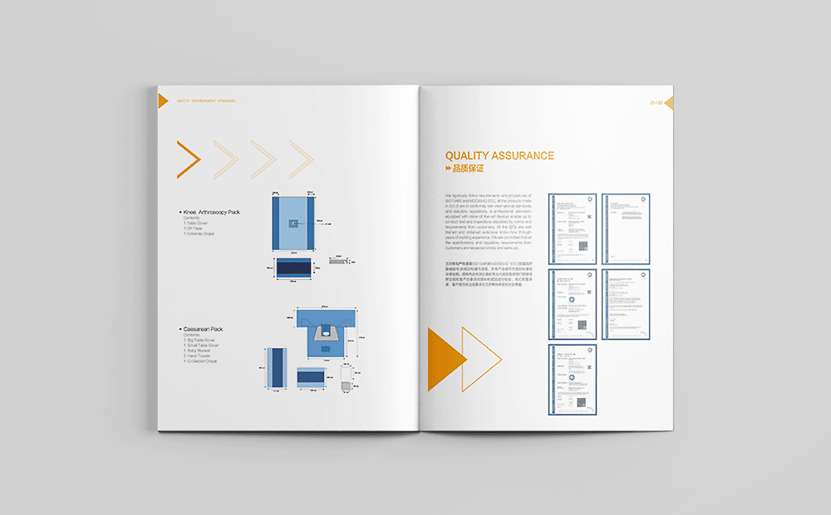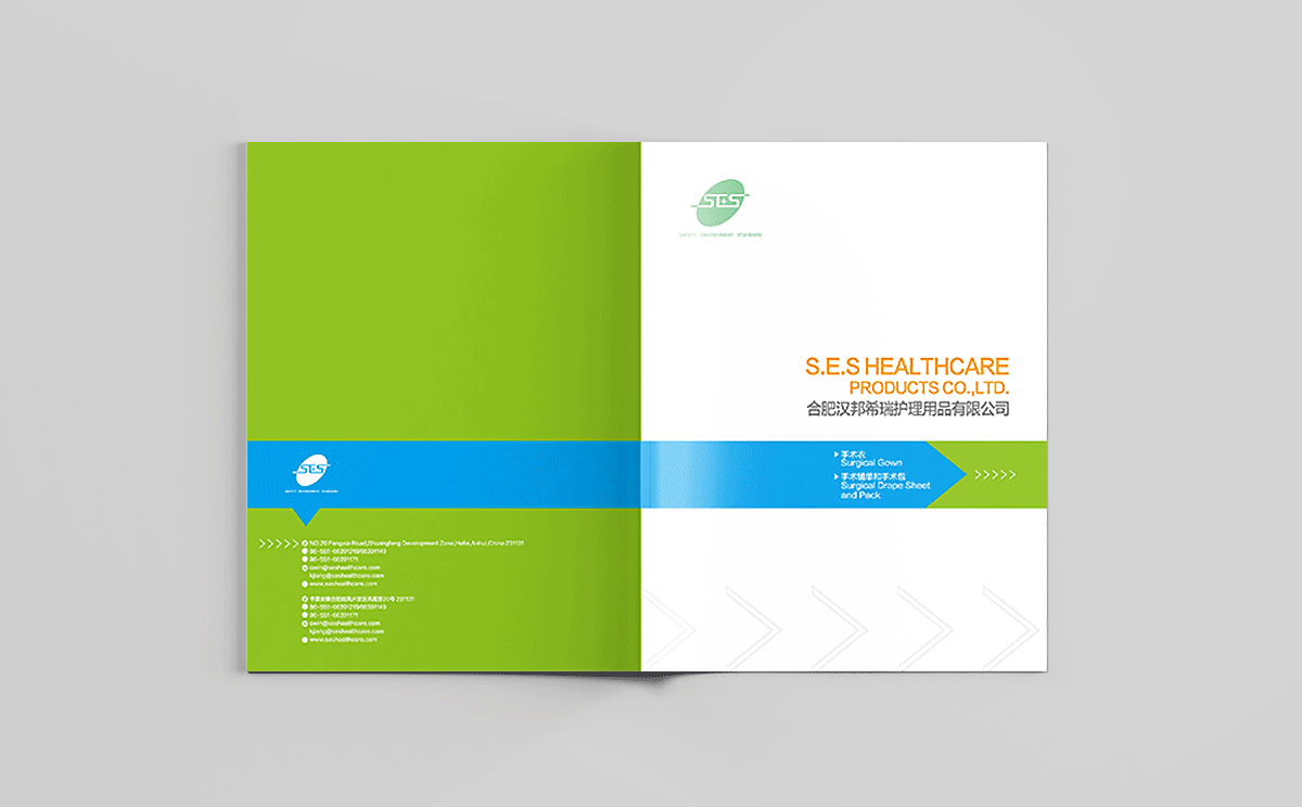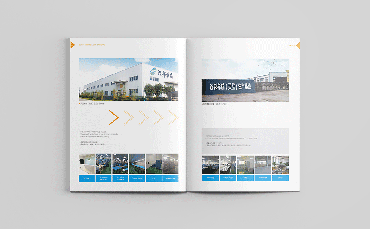 合肥汉邦希瑞护理用品有限公司的理是Safety,Environment,Standard,结合其医疗用品行业特性,采用健康绿、天蓝和活力橙色搭配为主色调,白色底为主,采用现代极简的设计风格,画面干净清爽,整体画册以箭头为素材进行视觉上的细节配合,增加设计感。