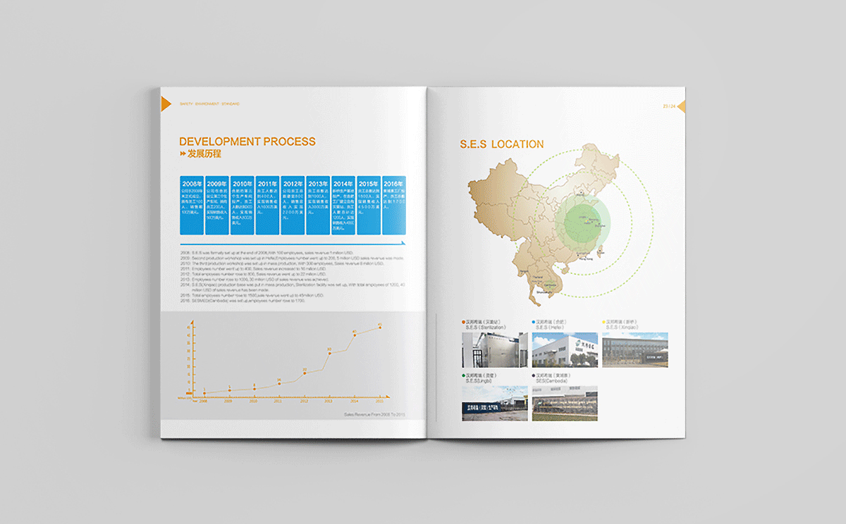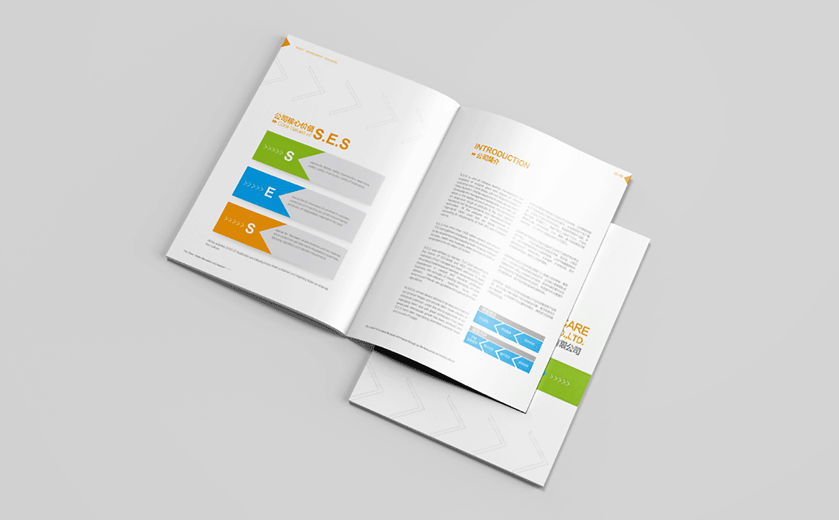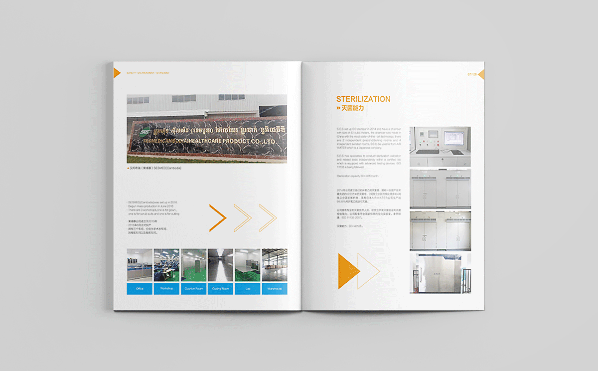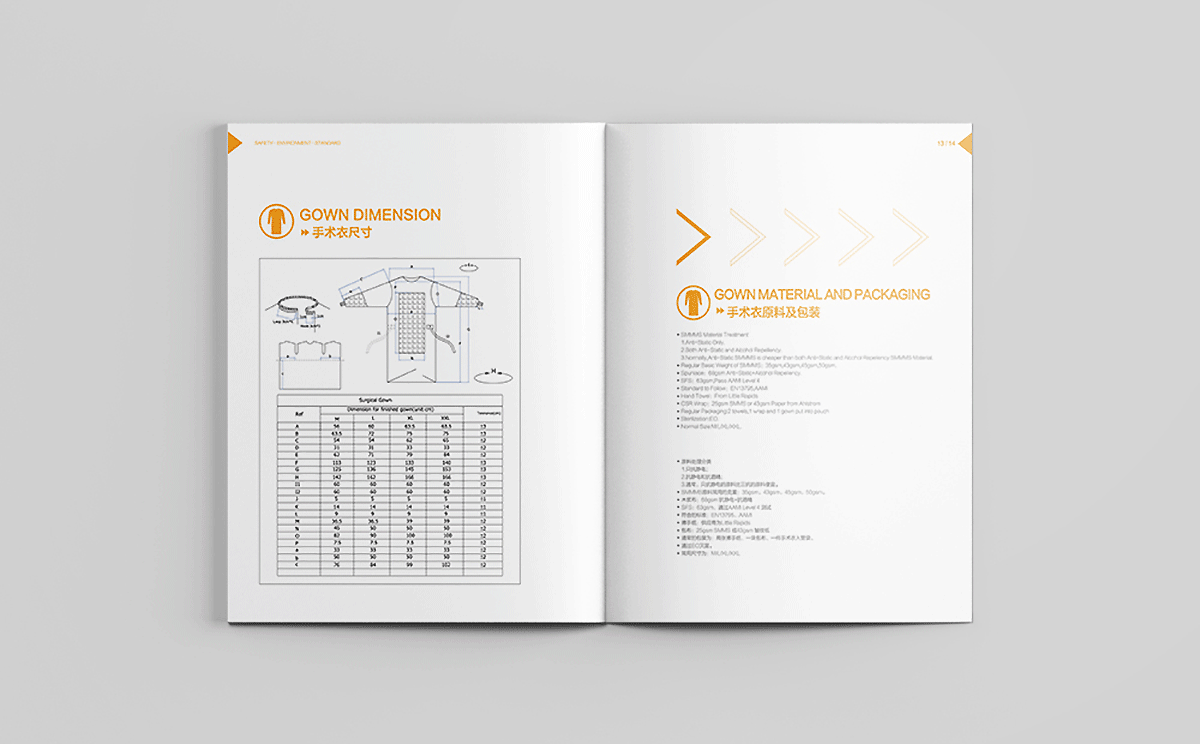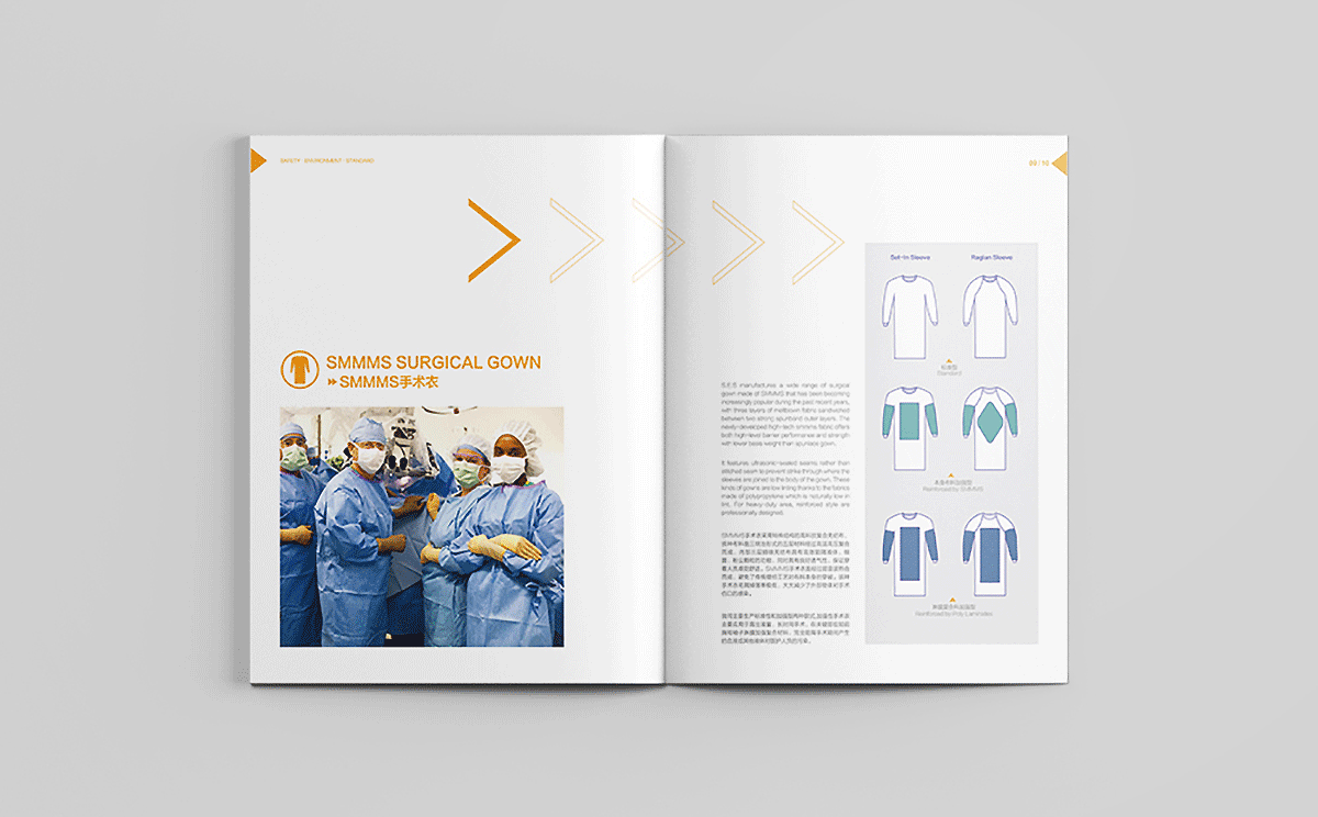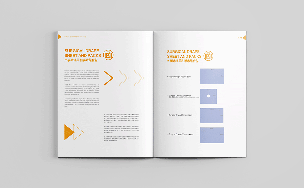合肥汉邦希瑞护理用品有限公司的理是Safety,Environment,Standard,结合其医疗用品行业特性,采用健康绿、天蓝和活力橙色搭配为主色调,白色底为主,采用现代极简的设计风格,画面干净清爽,整体画册以箭头为素材进行视觉上的细节配合,增加设计感。