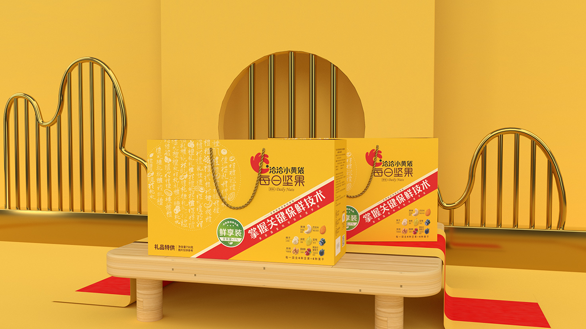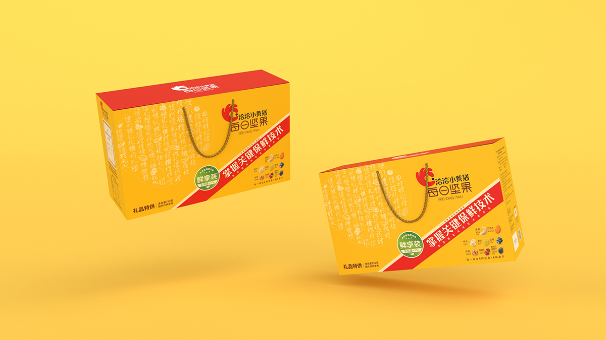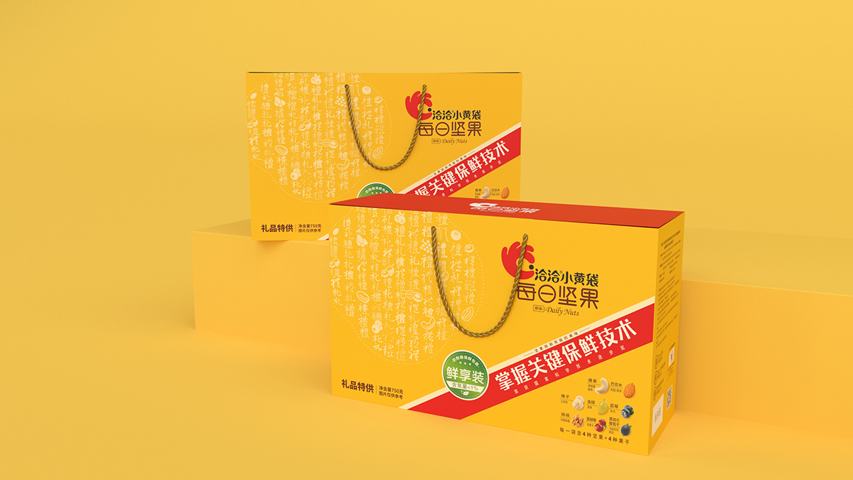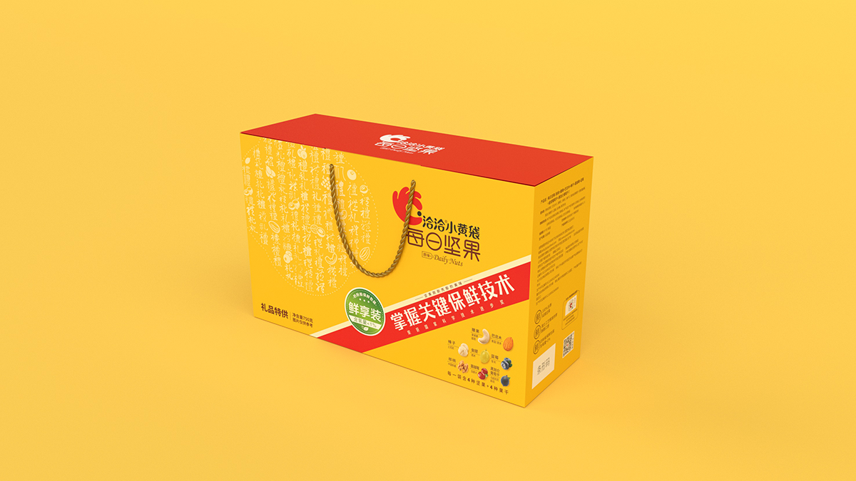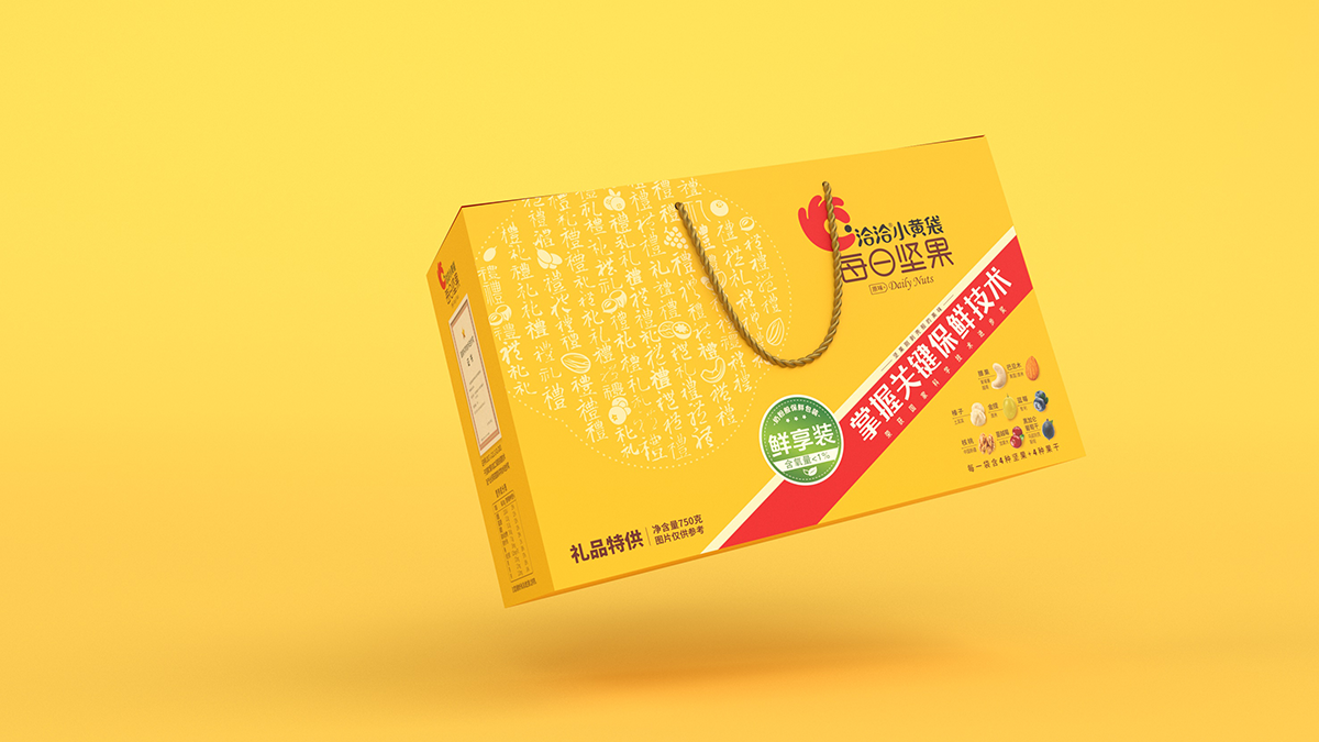礼盒盒型设计要求:符合礼盒产品属性,主要消费场景为企事业单位团购,作为福利品发放给员工礼盒图案设计要求:1、此款为小黄袋每日坚果作为团购礼盒款的特别包装,为满足团购/送礼消费场景的需求,在礼品及团购渠道售卖。2、在洽洽小黄袋每日坚果产品30日装包装的基础上做延展设计,部分元素必须呈现在礼盒款包装上。3、与常规款小黄袋每日坚果在包装需有明显的区别,将“礼品”“送礼”的属性扩大,可以想一个礼盒的名字标注在盒子上,方便消费者记忆,让消费者产生这是小黄袋每日坚果的礼盒款与常规款不一样的认知。