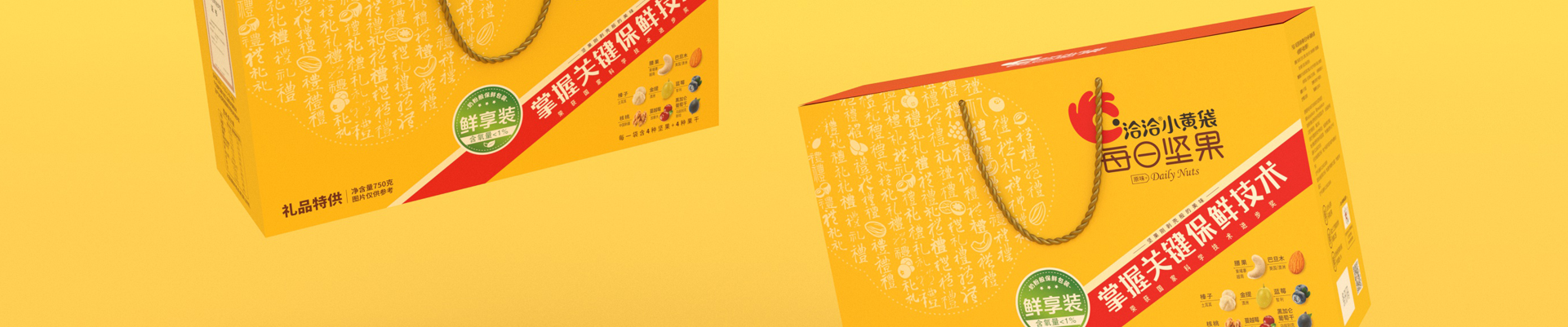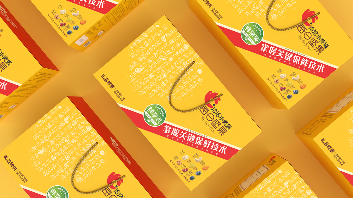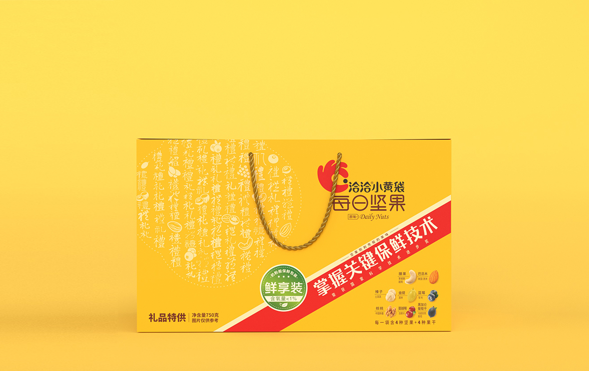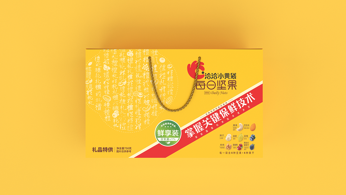 礼盒盒型设计要求:符合礼盒产品属性,主要消费场景为企事业单位团购,作为福利品发放给员工礼盒图案设计要求:1、此款为小黄袋每日坚果作为团购礼盒款的特别包装,为满足团购/送礼消费场景的需求,在礼品及团购渠道售卖。2、在洽洽小黄袋每日坚果产品30日装包装的基础上做延展设计,部分元素必须呈现在礼盒款包装上。3、与常规款小黄袋每日坚果在包装需有明显的区别,将“礼品”“送礼”的属性扩大,可以想一个礼盒的名字标注在盒子上,方便消费者记忆,让消费者产生这是小黄袋每日坚果的礼盒款与常规款不一样的认知。